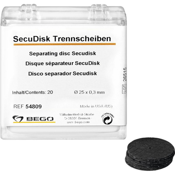 Zum Trennen und Separieren. BEGO-Trennscheiben sind hochfest und haben eine lange Lebensdauer.Sicheres Abtrennen der Gußkanäle durch hohe RundlaufpräzisionFeines Separieren in Keramik und MetallSecuDisc Trennscheiben mit beidseitig eingelegtem Glasfaser-GitterGesteigerte Bruchsicherheit und BenutzungsdauerHöhere Schnittleistung durch reduzierte Scheibenstärke Packung 20 Secudisc Trennscheiben, Ø 22 x 0,2 mm