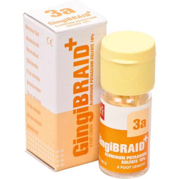 GingiBRAID+ vereinigt alle Vorteile von geflochtenen und gestrickten Fäden. Sehr gute Retraktion, GingiBRAID+ bleibt am Platz, hat nicht die Tendenz, in die Ursprungsform zurück zu gehen (memory effect). Die Fäden sind durch einen unterschiedlichen Farbstreifen leicht zu identifizieren. Geliefert wird GingiBRAID+ ungetränkt oder in Alaun getränkt. Flasche 183 cm Faden Größe 3a gelb mit rosa, imprägniert