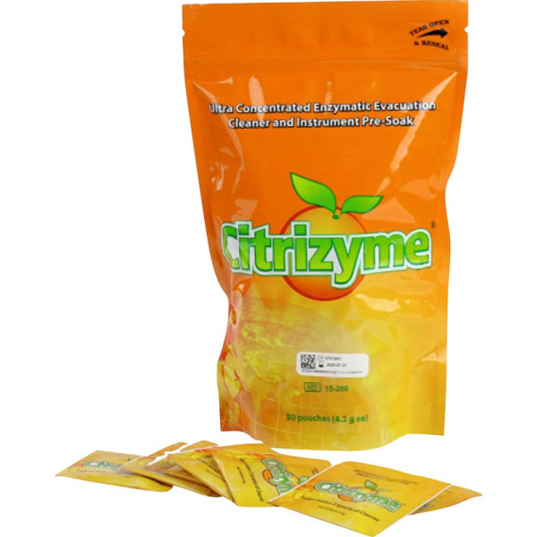 Citrizyme ist ein ultrakonzentriertes, 100 % natürliches Enzympulver zur effektiven Reinigung von Absauganlagen. Schnell wirksame duale Enzyme entfernen die im so genannten „grauen Schlamm“ (tote organische Materialien und Ablagerungen) enthaltenen Proteine und Kohlenhydrate. Citrizyme ist umweltschonend, schäumt nicht auf und trägt so zu einer längeren Lebensdauer Ihrer Absauganlagen bei. Packung 50 x 4,2 g Beutel