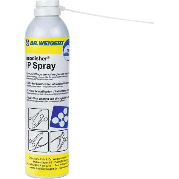 Instrumentenpflegemittel – Spray – zur gezielten manuellen Pflege von Gelenkinstrumenten nach der maschinellen Aufbereitung. Auf Basis von medizinischem Weißöl. Bewirkt keine Verkrustungen, beeinflusst eine nachfolgende Dampf- oder Heißluftsterilisation nicht. Toxikologisch unbedenklich. Spraydose 400 ml