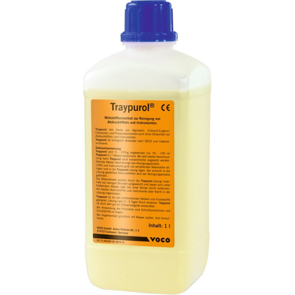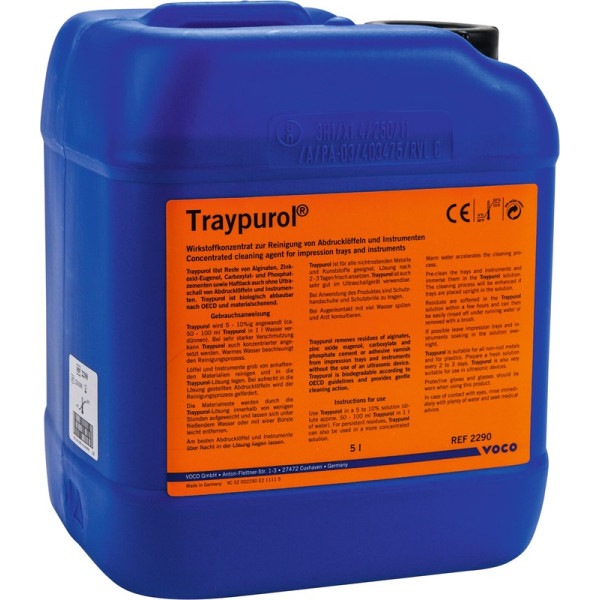 Bewährtes Wirkstoffkonzentrat zur selbsttätigen Reinigung von Abdrucklöffeln und Instrumenten. Traypurol löst Reste von Alginaten, Glasionomer-, Carboxylat-, Phosphat- und Zinkoxid-Eugenol-Zementen, ist biologisch abbaubar und materialschonend. Auch im Ultraschallgerät einsetzbar. Traypurol in praktischen Tabs! Im Gegensatz zu herkömmlichen Reinigungspulvern lösen sich VOCO Traypurol Tabs selbstständig in Wasser auf und sind daher besonders leicht zu dosieren. Jeweils zwei Tabs sind ausreichend für einen Liter Reinigungslösung. Durch die besondere Wirkstoffkombination sind Traypurol Tabs sehr ergiebig. Traypurol Tabs sind biologisch abbaubar, pH-neutral und damit materialschonend. Sie sind für alle nicht rostenden Metalle (auch Aluminium) und Kunststoffe geeignet. Kanister 5 Liter
