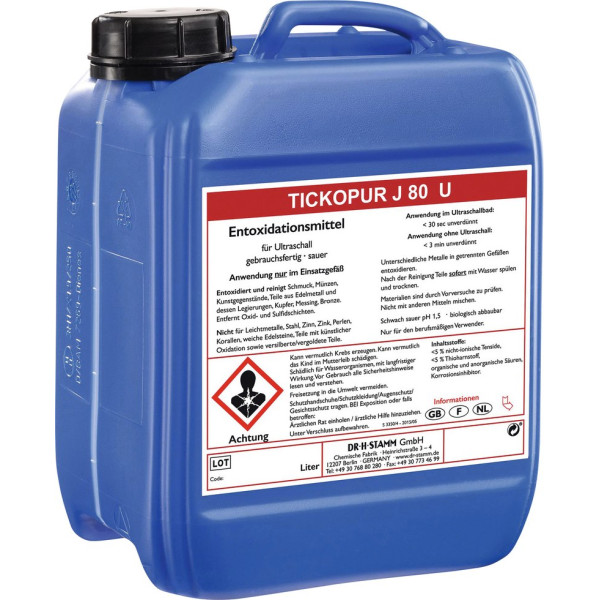 TICKOPUR J 80 U zur Entoxidation und Reinigung von Bunt- und Edelmetallen in Handwerk, Industrie und Laboratorien. Bei sachgemäßer Anwendung wird eine schnelle und materialschonende Entoxidation und Reinigung gewährleistet. TICKOPUR J 80 U ist speziell für die Entoxidation und Reinigung in SONOREX-Ultraschallgeräten, aber auch zur Tauch- und Wischanwendung einzusetzen. Flasche 1 Liter