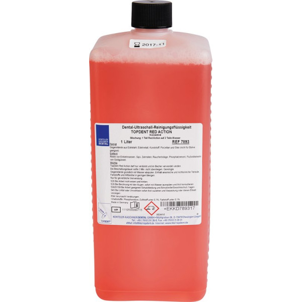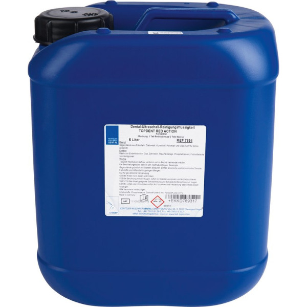 Effektives und leistungsstarkes Spezialkonzentrat für die Ultraschallreinigung im Dentallabor. Red Action entfernt Zahnstein, Raucherbeläge, Phosphatzemente und Flussmittelreste. Reinigt Gegenstände aus Edelstahl, Edelmetall, Kunststoff, Porzellan und Glas. Red Action verhält sich neutral zu Keramik.Konzentrat 1:2 Kanister 5 Liter
