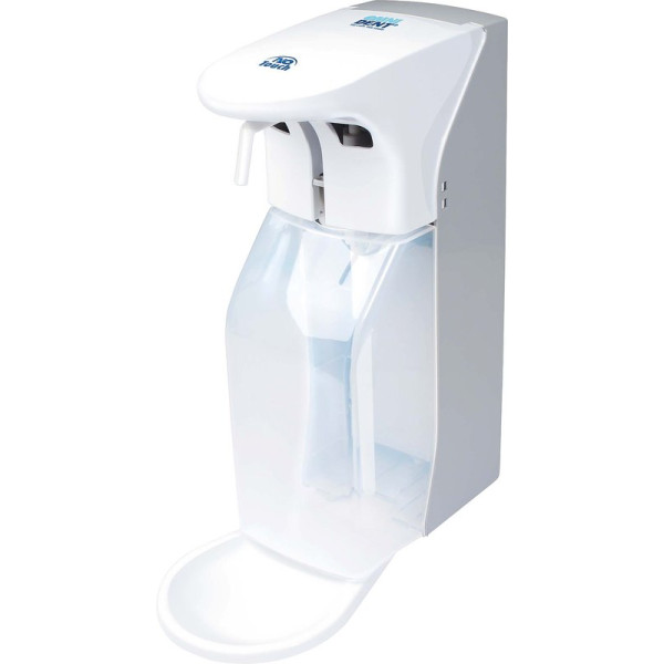 Automatischer Sensorspender OmniStar touchless. Sprühstöße individuell einstellbar (grünes LED Licht: ein Sprühstoß, rotes LED Licht: zwei Sprühstöße). Die Maße ohne Tropfschale: (B x H x T) 104 x 312 x 190 mm. Maße mit Tropfschale: (B x H x T) 121 x 320 x 247 mm. Für Seife und flüssige Händedesinfektionen (z.B. Omnihand) in 500- oder 1.000 ml – Eurospenderflaschen. Material: Kunststoff mit transparenter Frontklappe. Komplettset OmniStar touchless, Gelpumpe für Seife und Gels, Sprühpumpe für Flüssigkeiten (bereits montiert), Tropfschale, Sichtblende, Montageplatte, Platzhalter für 500 ml Flaschen, Pumpenröhrchen für 500 ml Flaschen, Schlüssel, 4 D Zelle Alkali Batterien