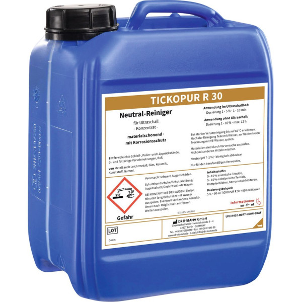 Zur besonders schonenden Reinigung und Entfettung von zerlegten und unzerlegten Maschinen, Werkzeug-, Glas- und Keramikteilen in Industrie, Handwerk und Laboratorien. TICKOPUR R 30 ist speziell für die Reinigung in SONOREX-Ultraschallgeräten, aber auch zur Tauch-, Wisch- und Hochdruckreinigung einzusetzen. Bei sachgemäßer Anwendung wird eine schnelle und materialschonende Reinigung gewährleistet. Flasche 1 Liter