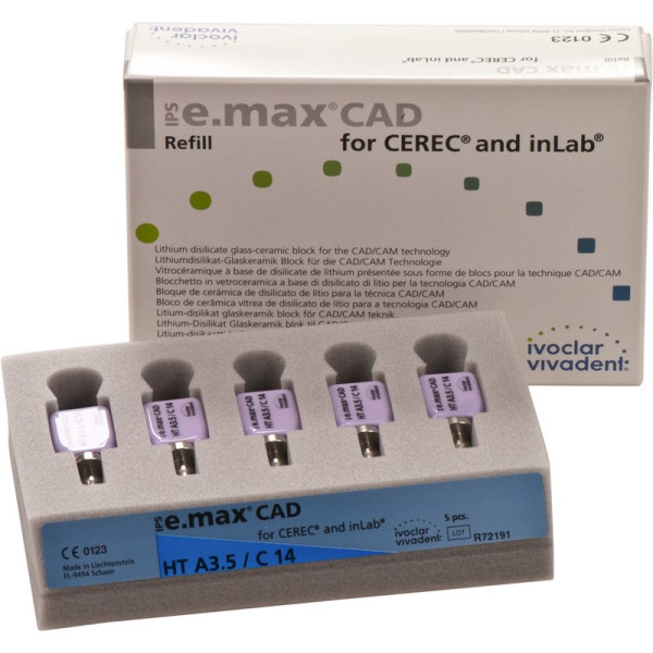 Die IPS e.max CAD for CEREC/inLab ist eine hochfeste Lithiumdisilikat-Vollkeramik, mit idealen ästhetischen Eigenschaften. Die Keramikblocks sind optimal für die Herstellung von vollanatomischen Kronen, Inlays und Veneers geeignet und werden im inLab-System oder CEREC-System (Sirona) verarbeitet. Die Blocks sind in unkristallisiertem Zustand bläulich und leicht bearbeitbar. Nach dem Kristallisationsbrand ist die Keramik zahnfarben und hochfest. IPS e.max Kronen aus CAD LT können selbstadhäsiv oder konventionell befestigt werden.Inlays und Veneers aus IPS e.max CAD HT können minimalinvasiv präpariert werden, werden jedoch adhäsiv befestigt.Im Basic Kit stehen alle für einen Einsteiger notwendigen Materialien für die Herstellung einer IPS e.max Krone aus CAD LT zur Verfügung stehen. Zum Brennen wird der Brennofen Programat CS2 oder CS3 (oder gleichwertige Geräte) empfohlen. Packung 5 Blöcke Größe C14, A3,5 HT