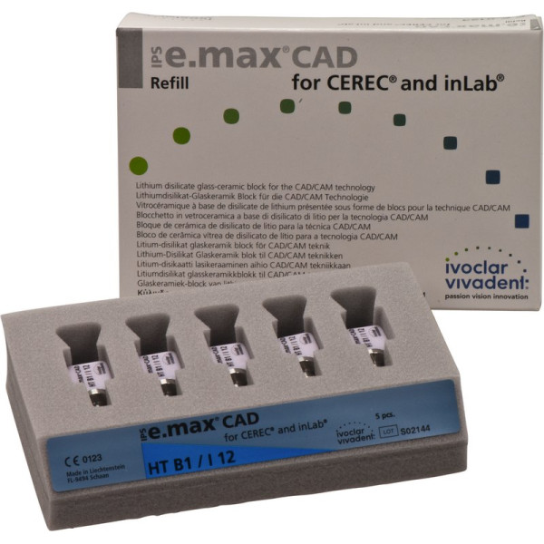 Die IPS e.max CAD for CEREC/inLab ist eine hochfeste Lithiumdisilikat-Vollkeramik, mit idealen ästhetischen Eigenschaften. Die Keramikblocks sind optimal für die Herstellung von vollanatomischen Kronen, Inlays und Veneers geeignet und werden im inLab-System oder CEREC-System (Sirona) verarbeitet. Die Blocks sind in unkristallisiertem Zustand bläulich und leicht bearbeitbar. Nach dem Kristallisationsbrand ist die Keramik zahnfarben und hochfest. IPS e.max Kronen aus CAD LT können selbstadhäsiv oder konventionell befestigt werden.Inlays und Veneers aus IPS e.max CAD HT können minimalinvasiv präpariert werden, werden jedoch adhäsiv befestigt.Im Basic Kit stehen alle für einen Einsteiger notwendigen Materialien für die Herstellung einer IPS e.max Krone aus CAD LT zur Verfügung stehen. Zum Brennen wird der Brennofen Programat CS2 oder CS3 (oder gleichwertige Geräte) empfohlen. Packung 5 Blöcke Größe I12, B1 HT