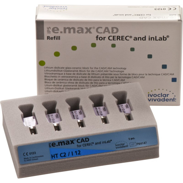 Die IPS e.max CAD for CEREC/inLab ist eine hochfeste Lithiumdisilikat-Vollkeramik, mit idealen ästhetischen Eigenschaften. Die Keramikblocks sind optimal für die Herstellung von vollanatomischen Kronen, Inlays und Veneers geeignet und werden im inLab-System oder CEREC-System (Sirona) verarbeitet. Die Blocks sind in unkristallisiertem Zustand bläulich und leicht bearbeitbar. Nach dem Kristallisationsbrand ist die Keramik zahnfarben und hochfest. IPS e.max Kronen aus CAD LT können selbstadhäsiv oder konventionell befestigt werden.Inlays und Veneers aus IPS e.max CAD HT können minimalinvasiv präpariert werden, werden jedoch adhäsiv befestigt.Im Basic Kit stehen alle für einen Einsteiger notwendigen Materialien für die Herstellung einer IPS e.max Krone aus CAD LT zur Verfügung stehen. Zum Brennen wird der Brennofen Programat CS2 oder CS3 (oder gleichwertige Geräte) empfohlen. Packung 5 Blöcke Größe I12, C2 HT