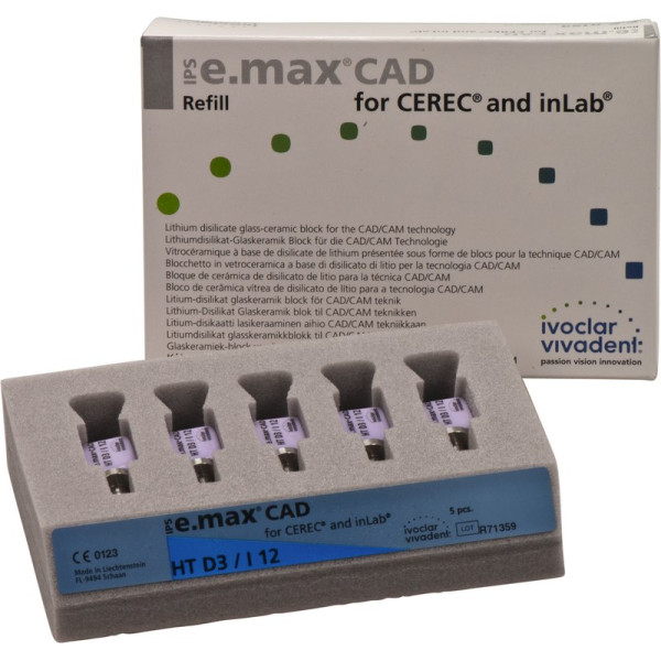 Die IPS e.max CAD for CEREC/inLab ist eine hochfeste Lithiumdisilikat-Vollkeramik, mit idealen ästhetischen Eigenschaften. Die Keramikblocks sind optimal für die Herstellung von vollanatomischen Kronen, Inlays und Veneers geeignet und werden im inLab-System oder CEREC-System (Sirona) verarbeitet. Die Blocks sind in unkristallisiertem Zustand bläulich und leicht bearbeitbar. Nach dem Kristallisationsbrand ist die Keramik zahnfarben und hochfest. IPS e.max Kronen aus CAD LT können selbstadhäsiv oder konventionell befestigt werden.Inlays und Veneers aus IPS e.max CAD HT können minimalinvasiv präpariert werden, werden jedoch adhäsiv befestigt.Im Basic Kit stehen alle für einen Einsteiger notwendigen Materialien für die Herstellung einer IPS e.max Krone aus CAD LT zur Verfügung stehen. Zum Brennen wird der Brennofen Programat CS2 oder CS3 (oder gleichwertige Geräte) empfohlen. Packung 5 Blöcke Größe I12, D3 HT