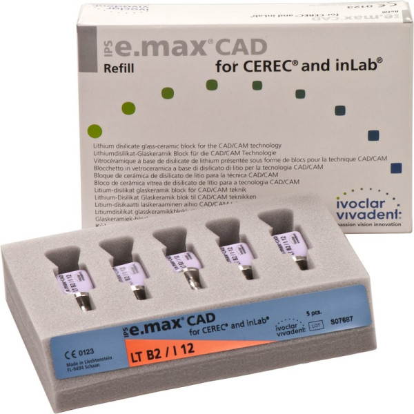 Die IPS e.max CAD for CEREC/inLab ist eine hochfeste Lithiumdisilikat-Vollkeramik, mit idealen ästhetischen Eigenschaften. Die Keramikblocks sind optimal für die Herstellung von vollanatomischen Kronen, Inlays und Veneers geeignet und werden im inLab-System oder CEREC-System (Sirona) verarbeitet. Die Blocks sind in unkristallisiertem Zustand bläulich und leicht bearbeitbar. Nach dem Kristallisationsbrand ist die Keramik zahnfarben und hochfest. IPS e.max Kronen aus CAD LT können selbstadhäsiv oder konventionell befestigt werden.Inlays und Veneers aus IPS e.max CAD HT können minimalinvasiv präpariert werden, werden jedoch adhäsiv befestigt.Im Basic Kit stehen alle für einen Einsteiger notwendigen Materialien für die Herstellung einer IPS e.max Krone aus CAD LT zur Verfügung stehen. Zum Brennen wird der Brennofen Programat CS2 oder CS3 (oder gleichwertige Geräte) empfohlen. Packung 5 Blöcke Größe I12, B2 LT