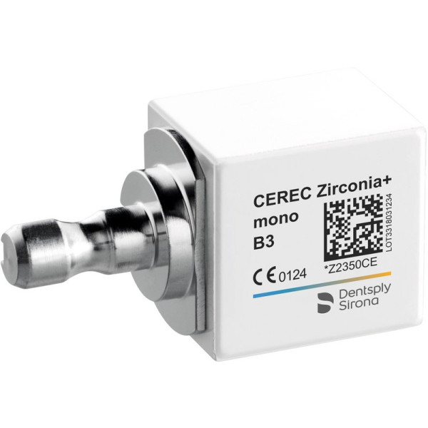 CEREC Zirconia+ ist ein voreingefärbtes, hochfestes, transluzentes Zirkondioxid. Das Material ist in 10 klassischen VITA-Farben erhältlich und benötigt keine weitere Einfärbung mit einem Liquid. Zunächst wird CEREC Zirconia+ trocken gefräst und erreicht nach dem darauffolgenden Sinterprozess seine endgültige Größe. Das vergrößerte Fräsen führt zu einer hohen Präzision und Passgenauigkeit der finalen Restauration. Das Material ist in zwei Größen (mono und medi) erhältlich, was eine Herstellung von bis zu 3-gliedrigen Brücken ermöglicht. Vorteile von CEREC Zirconia+ beinhalten Festigkeit größer als 900 MPa Biokompatibilität Verbesserte Transluzenz Optimierte Ästhetik Einfaches Matchen der VITA-Farben