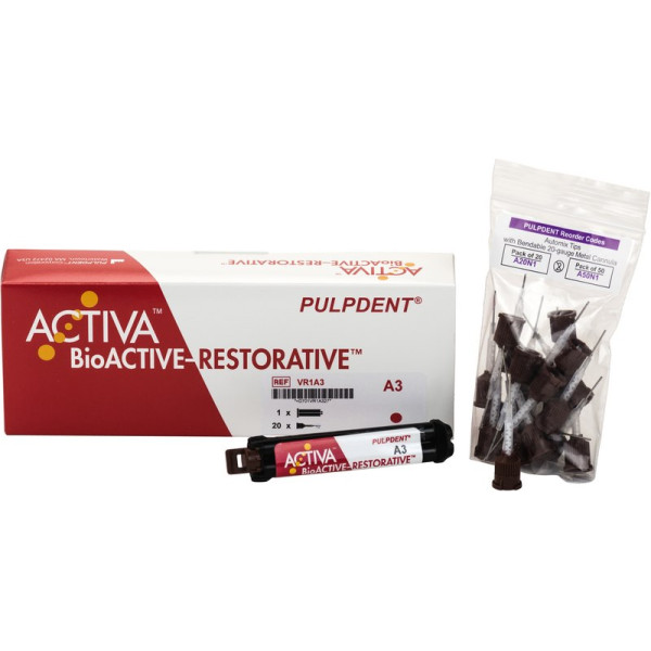 ACTIVA™ BioACTIVE Produkte sind die ersten dentalen Materialien mit einer bioaktiven Matrix ionisch vernetzter Kunststoffe, einer Komponente aus stoßabsorbierendem Kunststoff und Füllstoffen aus reaktiven Glasionomeren, welche die physikalischen und chemischen Eigenschaften des natürlichen Zahns nachempfinden. Diese bioaktiven Materialien sind aktiv an den Ionenaustauschzyklen beteiligt, die die natürliche Chemie der Zähne und des Speichels regulieren, und tragen zur Bewahrung von Zahnstruktur und Mundgesundheit bei. Die Vorteile im Überblick: Gibt Kalzium-, Phosphat- und Fluoridionen in das orale Milieu ab Aktive Beteiligung am Ionenaustausch von Speichel und Zähnen Feuchtigkeitsliebendes Material mit einer dynamischen Funktion im Mundmilieu Enthält H2O, ist jedoch kaum wasserlöslich Außergewöhnliche Randdichtigkeit und Versiegelung gegen das Eindringen von Bakterien Hohe Biege- und Abrasionsfestigkeit Dreifach härtend Radioopak Spritze 5 ml A3