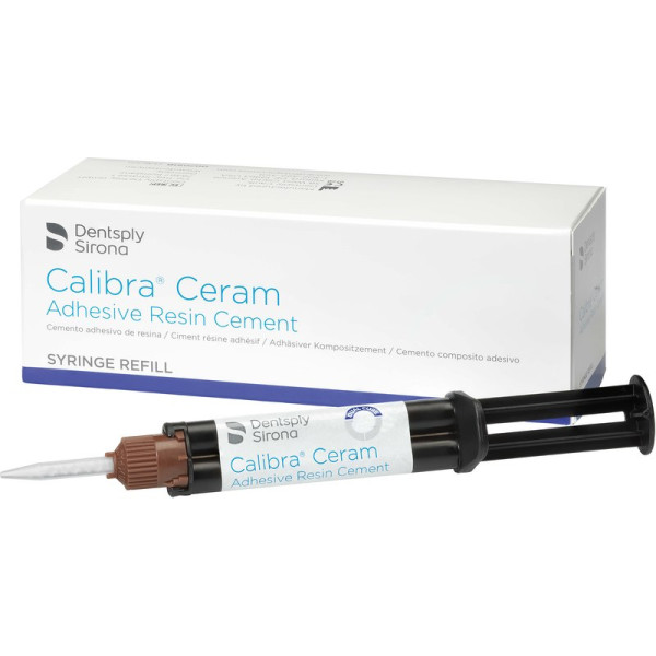 Der Calibra® Ceram adhäsive Kompositzement ist ein mit sichtbarem Licht härtender, dualhärtender oder selbsthärtender hochfester Kompositzement mit Fluorid. Der Calibra® Ceram Zement ist für die Verwendung nach dem Auftragen eines kompatiblen Dentin-/Schmelzadhäsivs konzipiert. Auch wenn er mit zahlreichen indirekten restaurativen Materialien kompatibel ist, gibt es besondere Anweisungen für die Verwendung mit lichtdurchlässigen Restaurationen. Packung 4,5 g Automix Spritze medium, 10 Mischkanülen