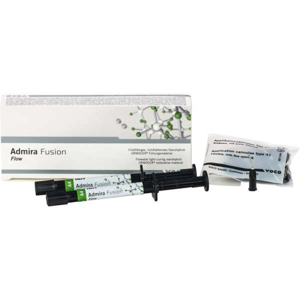 Fließfähiges, lichthärtendes Nanohybrid-ORMOCER Füllungsmaterial. Indikationen Füllungen von kleinen Kavitäten und bei erweiterter Fissurenversiegelung. Zum Ausblocken von Unterschnitten. Als Unterfüllung bzw. zum Auskleiden von Kavitäten. Füllungen der Kavitäten der Klassen III bis V. Füllungsreparaturen, Reparaturen von Verblendungen und temporären Restaurationen. Befestigung lichtdurchlässigen Zahnersatzes. Verblockung, Schienung von gelockerten Zähnen. VorteileDas weltweit erste rein keramisch basierte fließfähige Füllungsmaterial - Pure Silicate Technology, d. h. Füllstoffe und Harzmatrix rein auf Siliziumoxid-Basis. - Keine klassischen Monomere enthalten.Dank innovativster ORMOCER-Technologie - Extrem niedrige Polymerisationsschrumpfung (2,75 Vol.-%) und besonders niedriger Schrumpfungsstress im Vergleich zu allen herkömmlichen fließfähigen Füllungscomposites. - Inert, somit biokompatibel und extrem farbstabil.„Flow on demand“ – das Material ist nur unter Druck und Bewegung fließfähig. Nach Abschluss der Modellation ist es so standfest, dass es nicht aus der Kavität herausfließtHervorragendes Anfließverhalten mit vollständiger Benetzung der KavitätenwändeVOCO‘s patentierte, nachlauffreie und nicht tropfende NDT-Spritze sorgt für eine sichere und punktgenaue Applikation. Ungewollter Materialverlust gehört damit der Vergangenheit an12 Farben für ästhetische Restaurationen – perfekt abgestimmt auf das pastöste Admira FusionHervorragendes Handling, einfache Hochglanzpolitur sowie hohe Oberflächenhärte garantieren erstklassige Langzeit-ResultateMit allen konventionellen Bondings kompatibel Packung 2 x 2 g Spritze A4