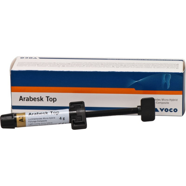Lichthärtendes Glaskeramik-Mikrohybrid Composite für Füllungen aller Klassen und für Inlays. Arabesk Top basiert auf einer neuentwickelten und speziell modifizierten Dual-Glaskeramik-Füllerstruktur und einer neuartigen Harzmatrix. Ein deutlicher Pluspunkt des Composites ist die verbesserte Anwendungsfreundlichkeit, durch die festere Konsistenz und maximal reduzierte Klebrigkeit. Die Dual-Füllerstruktur ermöglicht es, außerordentlich glatte, glänzende Oberflächen zu polieren. Zusammen mit dem Chamäleon-Effekt, d.h. die Füllung verschmilzt optisch mit der Zahnfarbe, lassen sich ausgezeichnete, natürlich aussehende Restaurationen erarbeiten. Zusätzlich konnten die wichtigsten chemisch-physikalischen Eigenschaften wie Abrasionsresistenz, Biegefestigkeit und Farbstabilität erheblich verbessert werden. Spritze 4 g A3