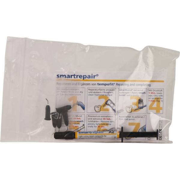 Systemreparaturmaterial für tempofit, ideale Konsistenz, lichthärtend. Für schnelle, präzise Reparaturen in sparsamen Direkt-Applikationsspritzen mit austauschbaren Applikationsnadeln. Abgestimmt auf die Farben von tempofit. Mit smartbond one-step bonding zur absolut sicheren Haftung des Reparaturmaterials auf der Reparaturstelle. Packung 1,5 g Spritze A2, 5 Applikationsnadeln