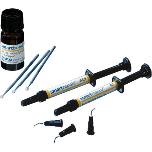 Systemreparaturmaterial für tempofit, ideale Konsistenz, lichthärtend. Für schnelle, präzise Reparaturen in sparsamen Direkt-Applikationsspritzen mit austauschbaren Applikationsnadeln. Abgestimmt auf die Farben von tempofit. Mit smartbond one-step bonding zur absolut sicheren Haftung des Reparaturmaterials auf der Reparaturstelle. Set 2 x 1,5 g Spritze (A2, A3,5), 5 ml smartbond, 5 smartbrush, 6 Applikationsnadeln, 1 Flowchart