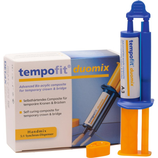 tempofit® duomix Bis-Acryl-Composite (5:1), selbsthärtend, für Kurz- und Langzeitprovisorien, druck- und abrasionsfest, normalabbindend, höchste okklusale Passgenauigkeit. Handmix im Synchron-Dispenser, speziell zum manuellen Anmischen. Exakte Dosierung - ohne Materialverlust in der Mischkanüle, unabhängig von diversen Austragegeräten. Standardpackung 4 x 25 g Dispenser A3