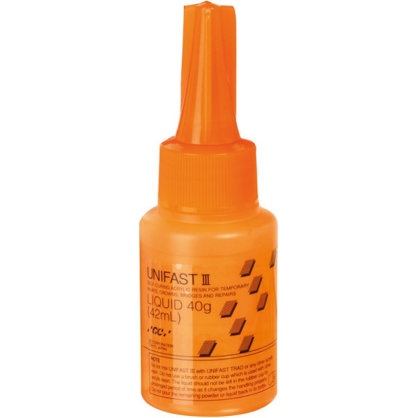 GC UNIFAST III ist ein selbsthärtender Acrylkunststoff für provisorische Inlays, Kronen, Brücken und Restaurationen. GC UNIFAST III - führt die SURF-Technologie (Surface Uniformity Revolutionary Fixation Technology), eine neue und revolutionäre Polymerverarbeitungstechnologie ein. Die Handhabung, die physikalischen Eigenschaften und die Ästhetik haben eine Klasse erreicht, die alle Erwartungen an Pulver-/Flüssigkeits-Kunststoffen weit übertreffen. GC UNIFAST III wird wie GC Pattern Resin in der Pinseltechnik verarbeitet. Kombination: Optiglaze. Nachfüllpackung 42 ml Flüssigkeit