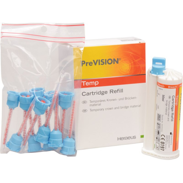 PreVISION® Temp ist ein selbsthärtendes 2-Komponenten Material für die provisorische Kronen- und Brückenversorgung in der praktischen 10:1 Automix-Kartusche. Dank seiner guten mechanischen Eigenschaften eignet sich das Material für kleinere Provisorien ebenso wie für mehrgliedrige Brücken. Die 6 erhältlichen Vita Farben sind perfekt mit Venus Diamond Flow abgestimmt und ermöglichen eine temporäre Versorgung mit hohem ästhetischen Anspruch. Refill Packung 50 ml Doppelkartusche A3,5, 12 Mixing Tips, 1 Gebrauchsanweisung, 1 Arbeitskarte