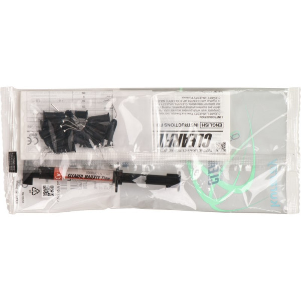 CLEARFIL MAJESTY™ Flow ist ein dünnfließendes, gleichzeitig jedoch hochgefülltes, lichthärtendes, radioopakes Hybridkomposit mit einem Fülleranteil von 81 Gew. %. Dank einer neuen Oberflächenbeschichtung der Füllkörper gelingt es Kuraray gute Fließfähigkeit und hohen Füllstoffanteil zu vereinen und ein gut anfließendes Komposit mit physikalischen Eigenschaften eines Hybridkomposits herzustellen. (Druckfestigkeit von 329 MPa, Biegefestigkeit von 145 MPa, niedrige Polymerisationsschrumpfung von 1,9%). Dank der innovativen Applikationsspritze lässt sich das thixotrophe Verhalten des Komposits perfekt und präzise steuern. Nach der blasenfreien Applikation verbleibt CLEARFIL MAJESTY™ Flowpunktgenau an der aufgetragenen Stelle ohne an der Applikationsspitze zu kleben oder Fäden zu ziehen. Packung 3,2 g Spritze cervical, 15 Applikationsspitzen