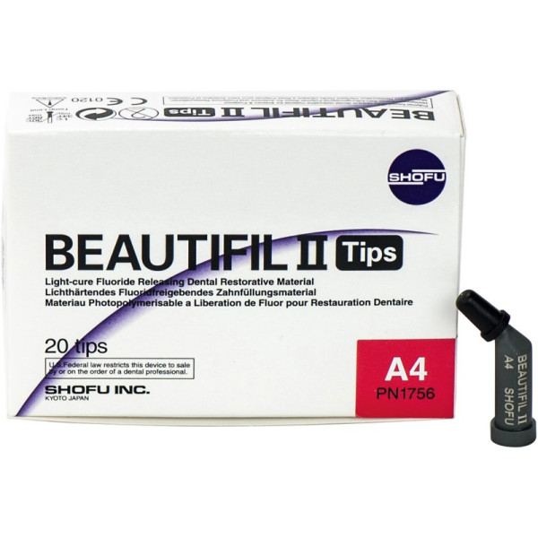 Beautifil II - Fluoridabgebendes Füllungsmaterial für den Front- und Seitenzahnbereich.Beautifil II überzeugt durch sein ästhetisches Erscheinungsbild mit einer ausgezeichneten Farbtonabstimmung und exzellenten Verarbeitungseigenschaften. Es werden dauerhaft Fluoride freigesetzt, die einen effektiven wirksamen Schutz vor Sekundärkaries bieten. Packung 20 x 0,25 g Tip A4