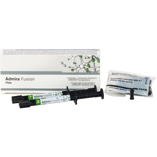 Fließfähiges, lichthärtendes Nanohybrid-ORMOCER Füllungsmaterial. Indikationen Füllungen von kleinen Kavitäten und bei erweiterter Fissurenversiegelung. Zum Ausblocken von Unterschnitten. Als Unterfüllung bzw. zum Auskleiden von Kavitäten. Füllungen der Kavitäten der Klassen III bis V. Füllungsreparaturen, Reparaturen von Verblendungen und temporären Restaurationen. Befestigung lichtdurchlässigen Zahnersatzes. Verblockung, Schienung von gelockerten Zähnen. VorteileDas weltweit erste rein keramisch basierte fließfähige Füllungsmaterial - Pure Silicate Technology, d. h. Füllstoffe und Harzmatrix rein auf Siliziumoxid-Basis. - Keine klassischen Monomere enthalten.Dank innovativster ORMOCER-Technologie - Extrem niedrige Polymerisationsschrumpfung (2,75 Vol.-%) und besonders niedriger Schrumpfungsstress im Vergleich zu allen herkömmlichen fließfähigen Füllungscomposites. - Inert, somit biokompatibel und extrem farbstabil.„Flow on demand“ – das Material ist nur unter Druck und Bewegung fließfähig. Nach Abschluss der Modellation ist es so standfest, dass es nicht aus der Kavität herausfließtHervorragendes Anfließverhalten mit vollständiger Benetzung der KavitätenwändeVOCO‘s patentierte, nachlauffreie und nicht tropfende NDT-Spritze sorgt für eine sichere und punktgenaue Applikation. Ungewollter Materialverlust gehört damit der Vergangenheit an12 Farben für ästhetische Restaurationen – perfekt abgestimmt auf das pastöste Admira FusionHervorragendes Handling, einfache Hochglanzpolitur sowie hohe Oberflächenhärte garantieren erstklassige Langzeit-ResultateMit allen konventionellen Bondings kompatibel Packung 2 x 2 g Spritze B2