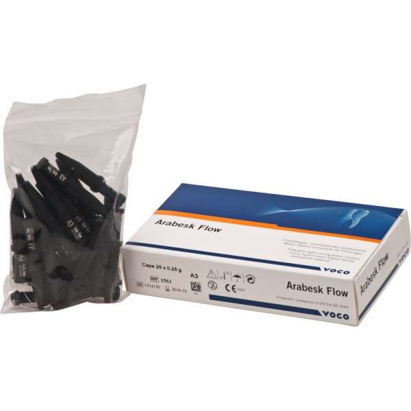 Besonders fließfähige Compositvariante auf der Basis von Arabesk Top. Für Füllungen bei Mikropräparationen und Approximalkavitäten, erweiterte Fissurenversiegelungen u. v. m. Arabesk Flow vereint die Materialvorzüge von Arabesk Top mit einer hohen Fließfähigkeit, die die Applikation in enge und kleine Kavitäten vereinfacht. Arabesk Flow in Caps ermöglicht die Direkt-Applikation. Packung 25 x 0,25 g Cap A3