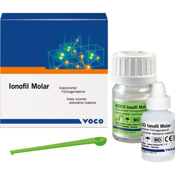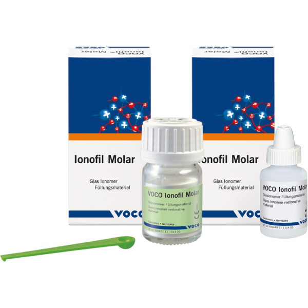 Stopfbarer, röntgensichtbarer Glasionomer-Zement für Füllungen und Stumpfaufbauten als Amalgam-Alternative. Der chemisch härtende Zement ist speziell für die Anwendung im Molarenbereich indiziert. Ionofil Molar verfügt über eine sehr gute, amalgamähnlich stopfbare Konsistenz. Gleichzeitig bewirkt die neuartige Glastechnologie verbesserte chemisch-pysikalische Eigenschaften wie hohe Haftung an der Zahnhartsubstanz, ausgezeichnete Druck- und Biegefestigkeit sowie ausgesprochen niedrige Abrasionswerte. Drei transluzente Farben für ästhetische Füllungen, kontinuierliche Fluoridabgabe und eine kurze Abbindezeit komplettieren die Vorteile von Ionofil Molar. Packung 10 ml Flüssigkeit